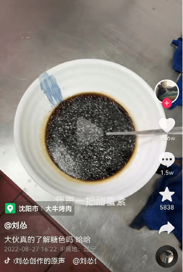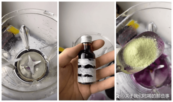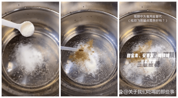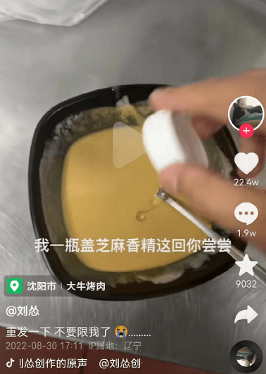 另一位“美食博主”刘怂也为大家带来了“科技食物”的详细制作方法。普通的一勺花生酱,加点自来水,加点食用油,加点焦糖色素,加点芝麻香精后,一碗外面卖的芝麻酱就做好了。