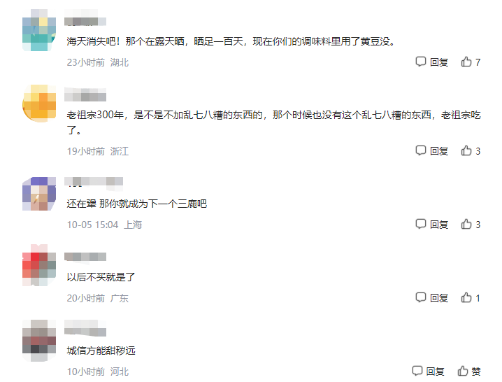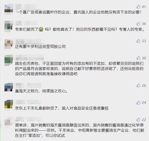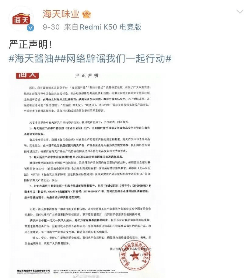 同时,中国调味品协会表示,“支持因舆情受到影响的调味品企业依法维权,追究网络造谣者的法律责任。”