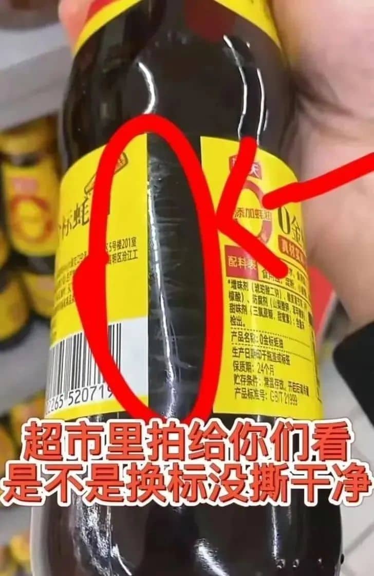 我们可以看到这瓶海天蚝油瓶子上,明显有着原来的旧标签,而且还有着大量的胶水。海天这一招改头换面,是不是有些“此地无银三百两”了。这不是明摆着告诉别人,海天里面的配料还是原来的配料,只是外面的标签换了而已。这不是掩耳盗铃,自欺欺人吗?