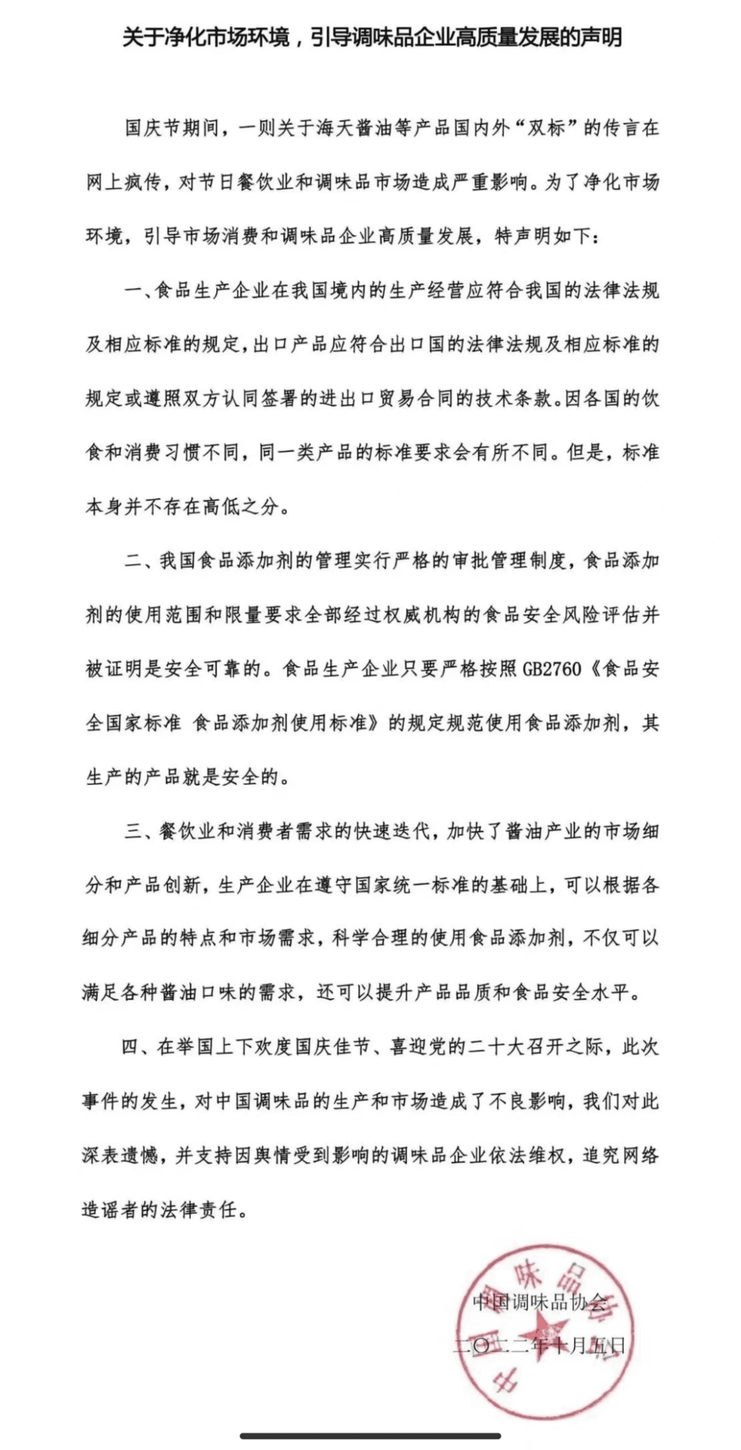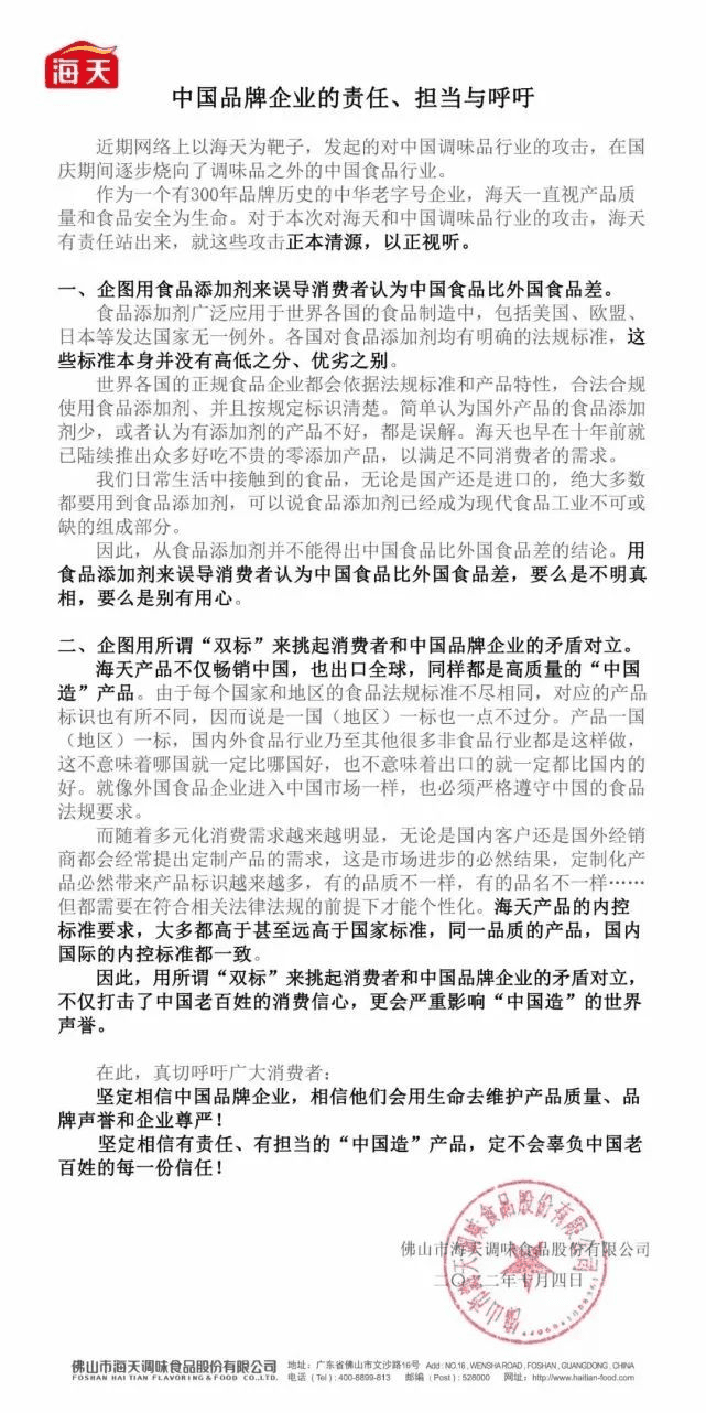 10月4日,海天味业在其微信公众号再次发文表示,食品添加剂广泛应用于世界各国的食品制造中,各国对食品添加剂均有明确的法规标准,这些标准本身没有高低之分、优劣之别。“世界各国的正规食品企业都会依据法规标准和产品特性,合法合规使用食品添加剂,并且按规定标识清楚。”