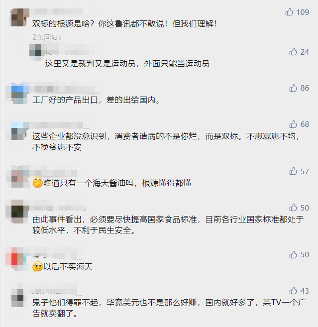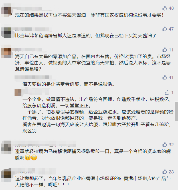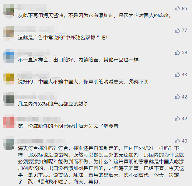 对于被指产品“双标”,海天味业在声明中解释称,每个国家和地区的食品法规标准不尽相同,对应的产品标识也有不同。产品一国(地区)一标,国内外食品行业乃至其他很多非食品行业都是这样做。随着多元化消费需求,无论是国内客户还是国外经销商都会经常提出定制产品的需求,定制化产品必然带来产品标识越来越多,有的品质不一样,有的品名不一样。海天产品的内控标准要求大多都高于甚至远高于国家标准,同一品质的产品,国内国际的内控标准都一致。“用‘双标’挑起消费者和中国品牌企业的矛盾对立,不仅打击了中国老百姓的消费信心,更会影响‘中国造’的世界声誉。”