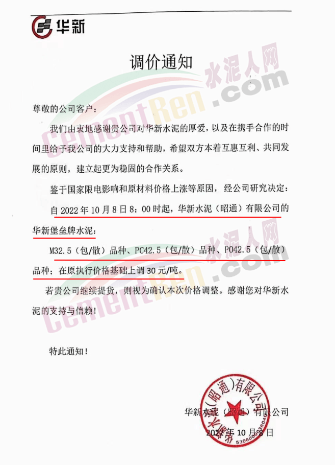 水泥人网通讯员消息,日前,华新水泥昭通公司通知,鉴于国家限电影响和原材料价格上涨等原因,经公司研究决定自10月8日8时起,华新堡垒牌水泥在原执行价格基础上上调30元/吨。