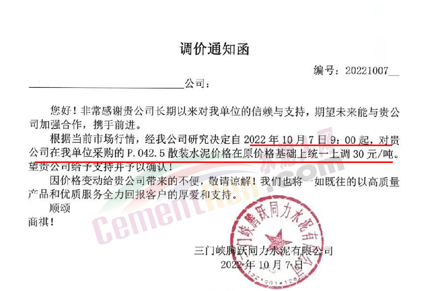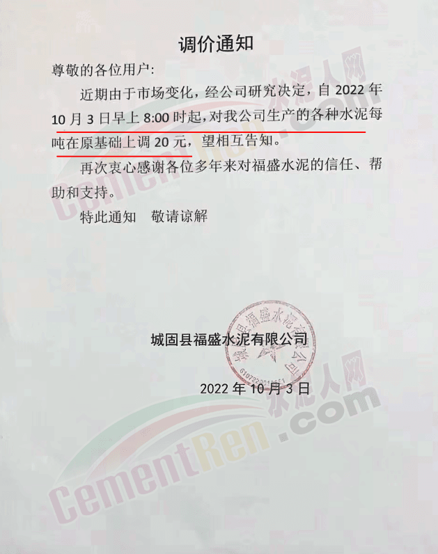 陕西省汉中市城固县福盛水泥有限公司通知自10月3日早上8时起,对公司生产的各种水泥上调20元/吨。