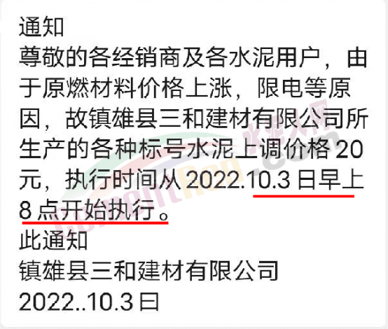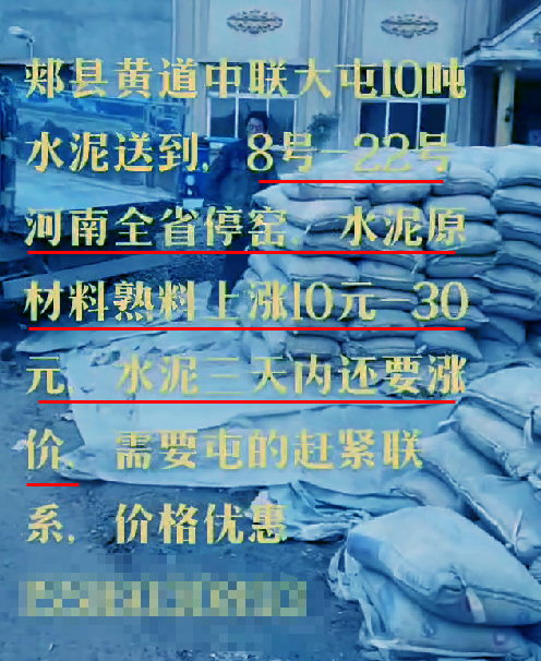 有水泥经销商通知:“8号-22号河南全省停窑,水泥原材料熟料上涨10元-30元,水泥三天内还要涨价,需要囤水泥的赶紧联系!”