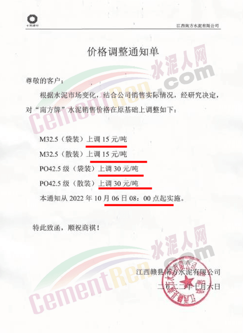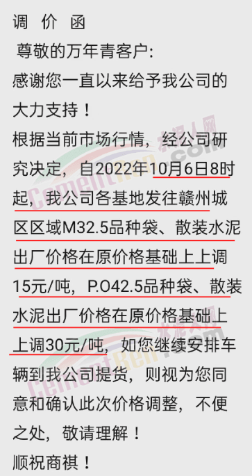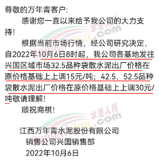 江西万年青水泥股份有限公司通知,自10月6日8时起,公司各基地发往赣州城区以及兴国区域32.5水泥出厂价上调15元/吨,42.5、52.5水泥出厂价上调30元/吨。