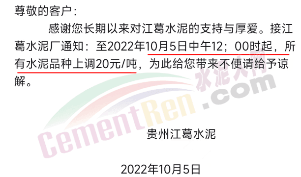 贵州江葛水泥通知,自10月5日中午12时起,所有水泥品种上调20元/吨。