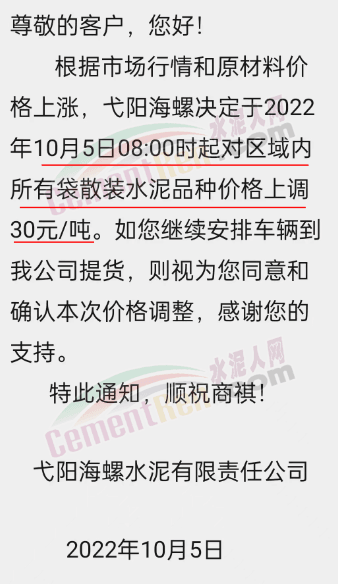 弋阳海螺水泥有限责任公司通知自10月5日8时起对区域内所有水泥品种价格上调30元/吨。