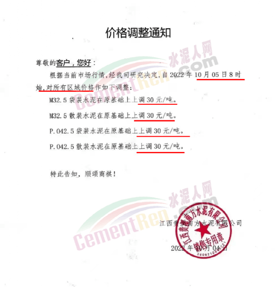 江西赣县南方水泥有限公司通知,自10月6日8时起各标号水泥上调15-30元/吨。