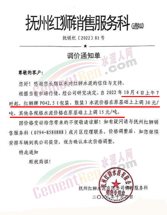抚州红狮水泥有限公司销售服务科通知,自10月4日上午7时起,红狮牌P.O42.5水泥价格上调30元/吨,其他规格水泥上调15元/吨。
