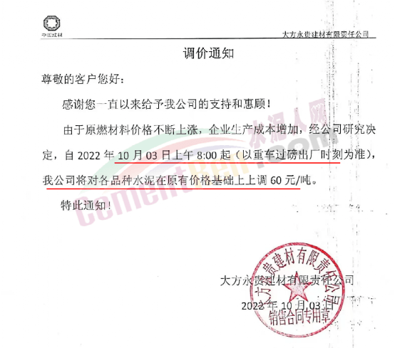 大方永贵建材有限公司通知,自10月3日上午8时起,各品种水泥在原价基础上上调60元/吨。