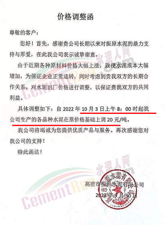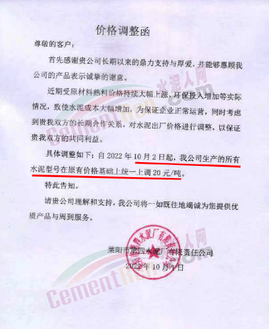 莱阳市第四水泥厂有限责任公司价格调整函称,近期受原材料熟料价格持续大幅上涨,环保投入增加等实际情况,致使水泥成本大幅增加,为保证企业正常运营,自10月2日起对水泥出厂价格统一上调20元/吨。