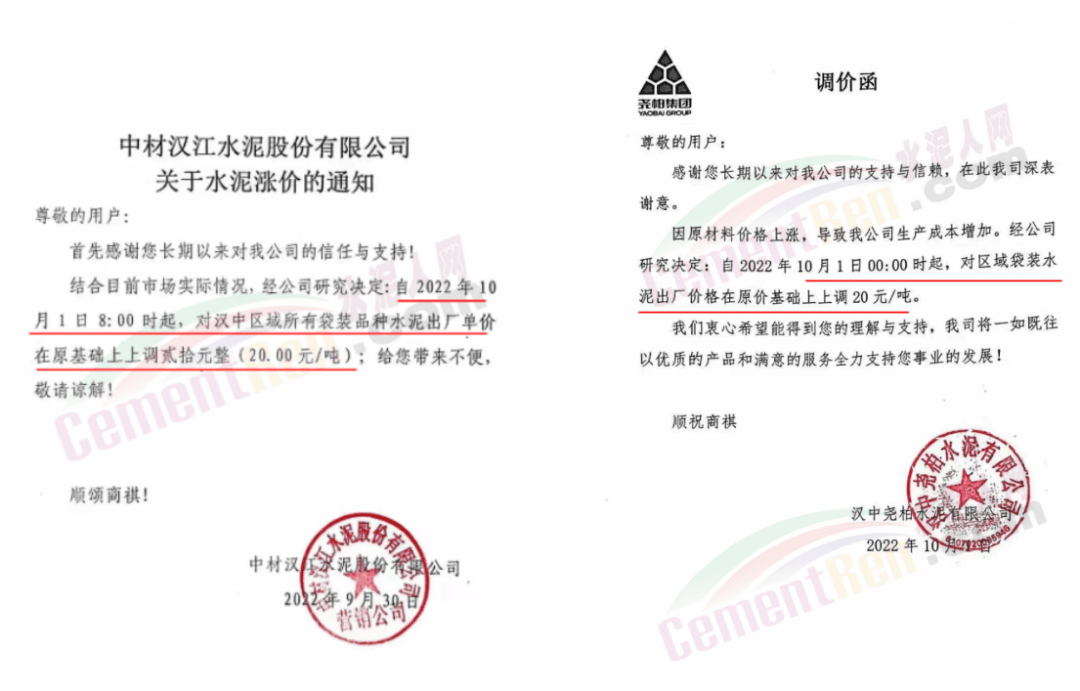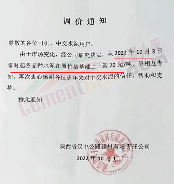 陕西省汉中公路建材有限责任公司通知10月3日零时起各品种水泥在原价基础上上调20元/吨。