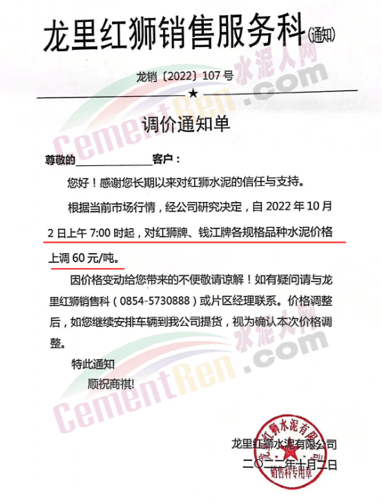 龙里红狮水泥有限公司通知自10月2日上午7时起,对红狮牌、钱江牌各规格品种水泥价格上调60元/吨。