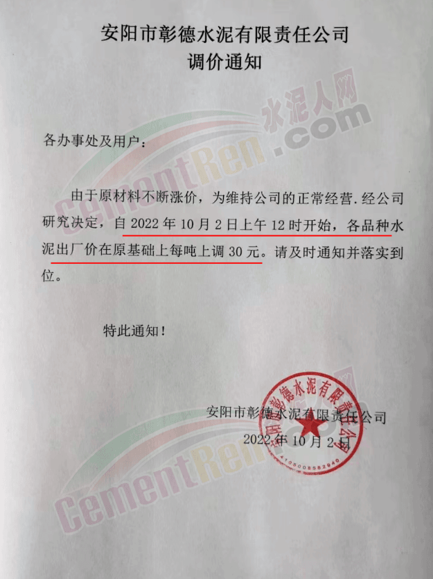 河南安阳彰德水泥有限责任公司通知由于原材料不断涨价,为维持公司的正常经营,经公司研究决定,自10月2日上午12时起,各品种水泥出厂价上调30元/吨。