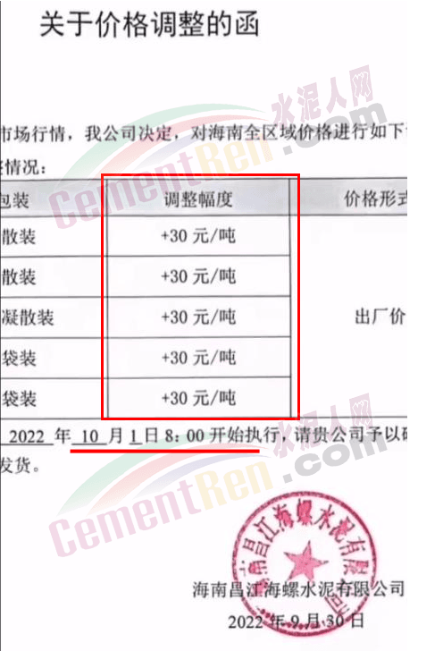 海南昌江海螺水泥有限公司通知自10月1日8时起各标号水泥出厂价上调30元/吨。