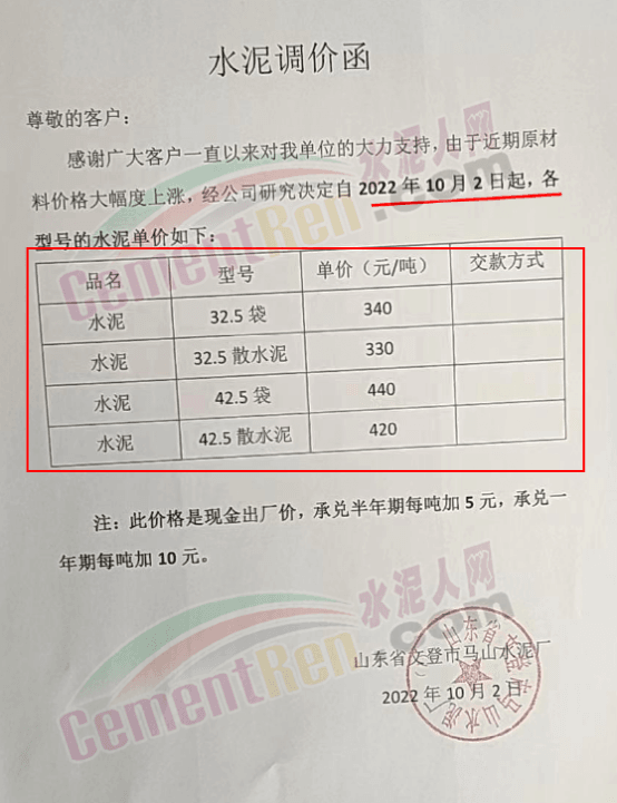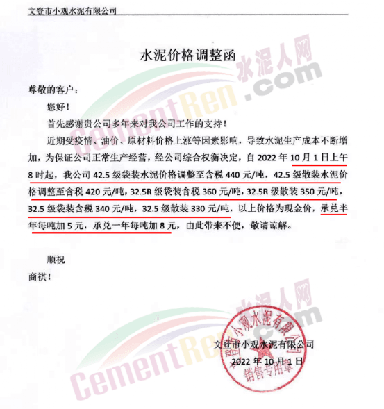 文登市小观水泥有限公司价格调整函称,近期受疫情、油价、原材料价格上涨等因素影响,导致水泥生产成本不断增加,为保证公司正常生产经营,经公司综合权衡决定,自2022年10月1日上午8时起,公司42.5级袋装水泥价格调整至含税440元/吨,42.5级散装水泥价格调整至含税420元/吨,32.5R级袋装含税360元/吨,32.5R级散装350元/吨,32.5级袋装含税340元/吨,32.5级散装330元/吨,以上价格为现金价,承兑半年每吨加5元,承兑一年每吨加8元。