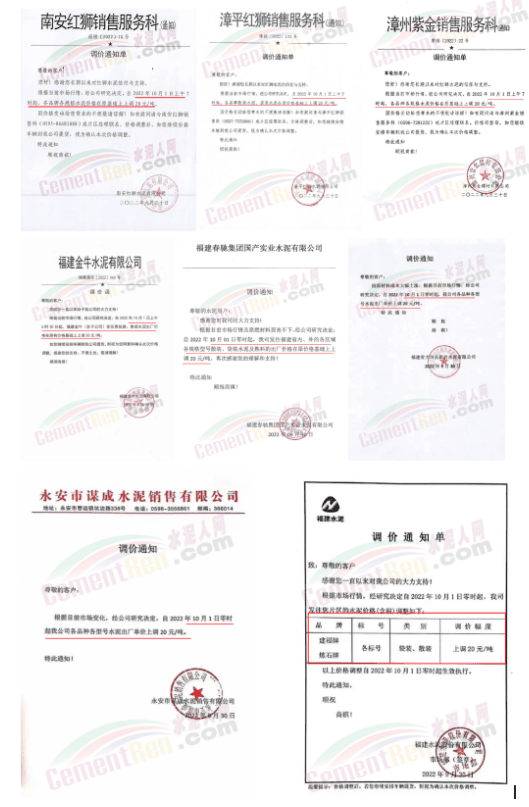 福建水泥销售经理通知,10月1日起所有销售片区所有水泥品种上调20元/吨,预计10月10日将再次上调40元/吨。