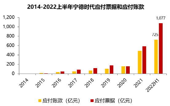 面对营业成本的快速上升和不断扩大的产能,宁德时代资金支付需求快速上升。企业对供应商的欠款一般在资产负债表中计入应付账款和应付票据项目中,宁德时代2012-2022上半年应付账款和应付票据变化情况如下: