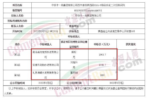 9月初,陕西区域,中铁十一局某项目水泥招标,中标候选人包括两家尧柏水泥和一家海螺水泥。从排序来看,海螺水泥位于第3名,中标价与两家尧柏水泥相差123.3万元和48.3万元,而这第3名等同于没有中标。