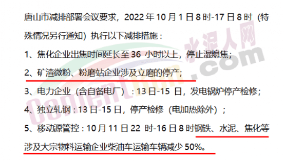 据水泥人网通讯员消息,河北省唐山市减排部署会议要求,2022年10月1日8时-17日8时执行减排措施∶矿渣微粉、粉磨站企业涉及立磨的停产;10月11日22时至-16日8时钢铁、水泥、焦化等涉及大宗物料运输企业柴油车运输车辆减少50%。