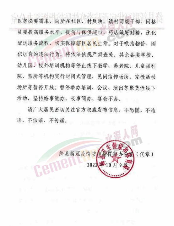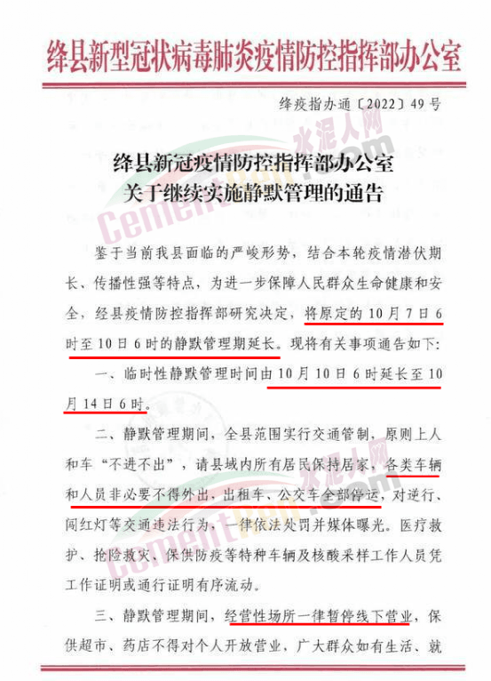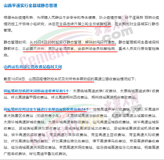 与山西内蒙接壤的河北省张家口市近来也出现散发疫情。部分区域实施临时管控。据当地水泥企业反馈,日前收到紧急通知称,按防疫指挥部要求,10月11日零点开始,全市封城,请各企业抓紧在今天下午准备好三天的物资(吃住用),需要生产的所有企业一律全封闭式待在企业,企业员工在企业吃住,不准出门,至少住三天以上,其余不需要生产的企业通知员工做好居家管理。凌晨后马路上不能见到一车一人,所有路段实行了物理隔离。