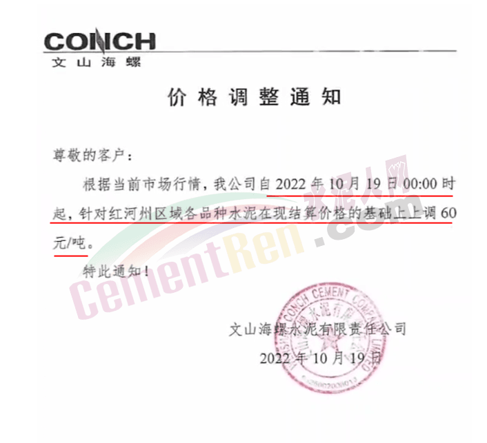 弥勒市河湾水泥制造有限责任公司发调价函称,因近期原燃材料价格上涨及国家能耗双控政策影响,导致公司生产成本增加,经公司研究决定,自2022年10月19日7∶00时起,我公司各品种水泥出厂价格在原基础上上调60元/吨。
