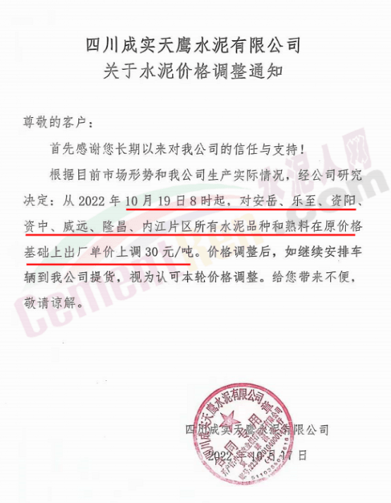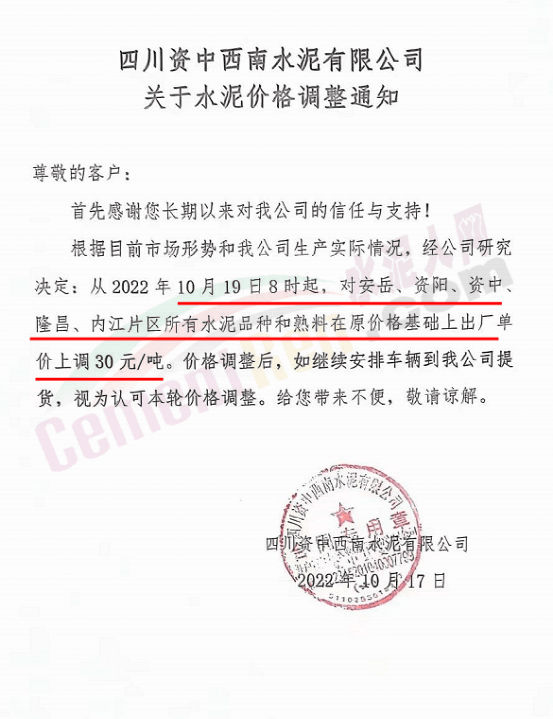 四川威远西南水泥、资中西南水泥、四川成实天鹰水泥通知,10月19日起,所有水泥品种和熟料价格上调30元/吨。