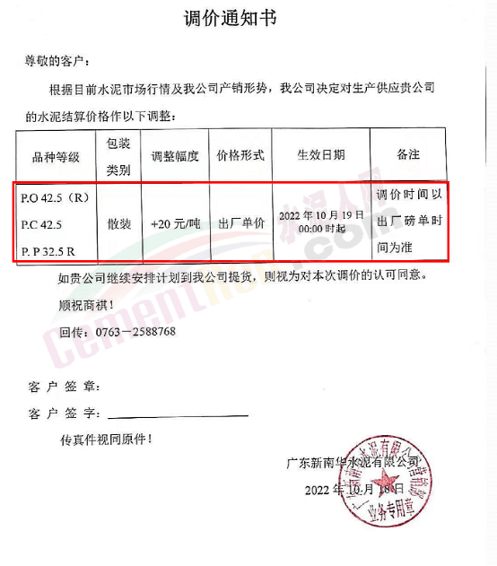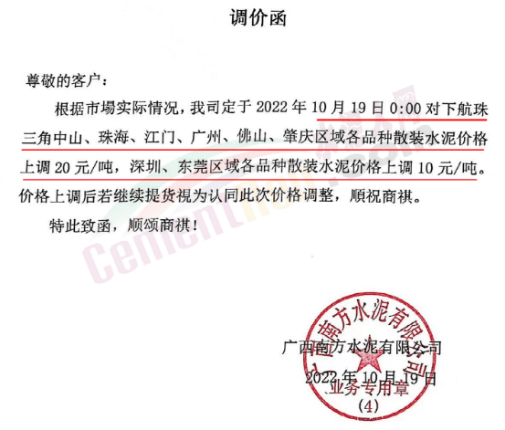 广西南方水泥、广东新南华水泥有限公司通知,10月19日0时起上调各标号水泥10-20元/吨。