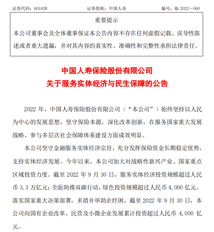 除国有大行外,中国人寿保险16日也发布公告称,充分发挥保险资金长期稳定优势,支持实体经济发展。截至9月末,该公司服务实体经济投资规模超过人民币3.3万亿元;在全国承办200多个大病保险项目,覆盖近3.5亿人。