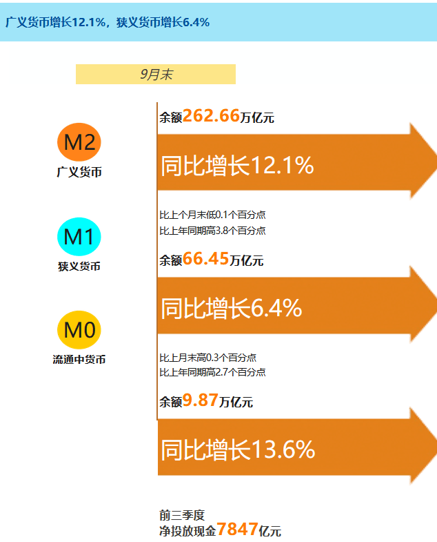 9月末,广义货币(M2)余额262.66万亿元,同比增长12.1%,增速比上月末低0.1个百分点,比上年同期高3.8个百分点;狭义货币(M1)余额66.45万亿元,同比增长6.4%,增速分别比上月末和上年同期高0.3个和2.7个百分点;流通中货币(M0)余额9.87万亿元,同比增长13.6%。前三季度净投放现金7847亿元。