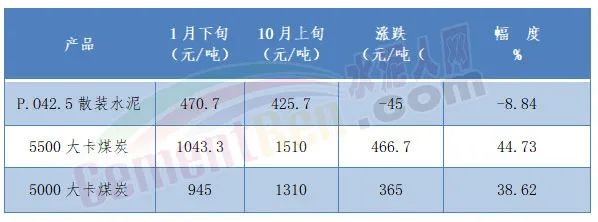 国家统计局数据显示,今年1月下旬至10月上旬 P.O42.5散装水泥市场均价下跌45元/吨,跌幅为8.84%;5500大卡煤炭价格却上涨了466.7元/吨;5000大卡煤炭价格上涨了365元/吨;涨幅分别为44.73%和38.62%。