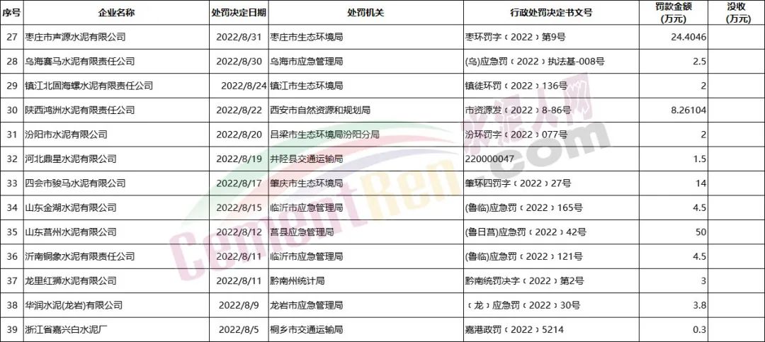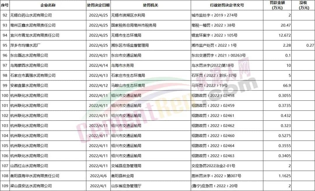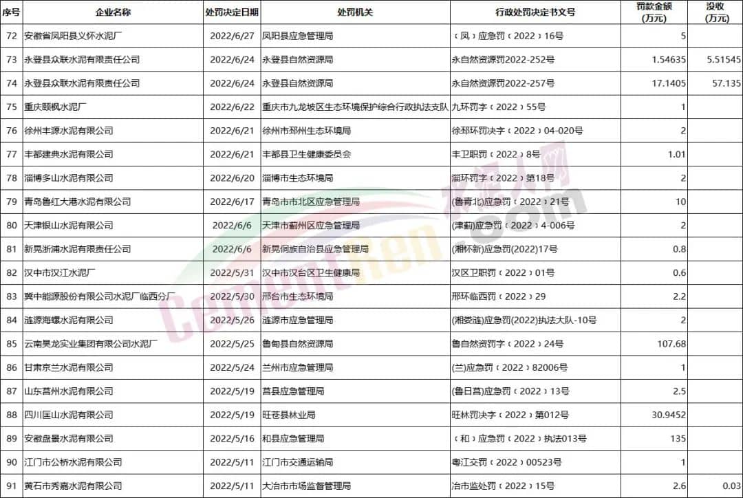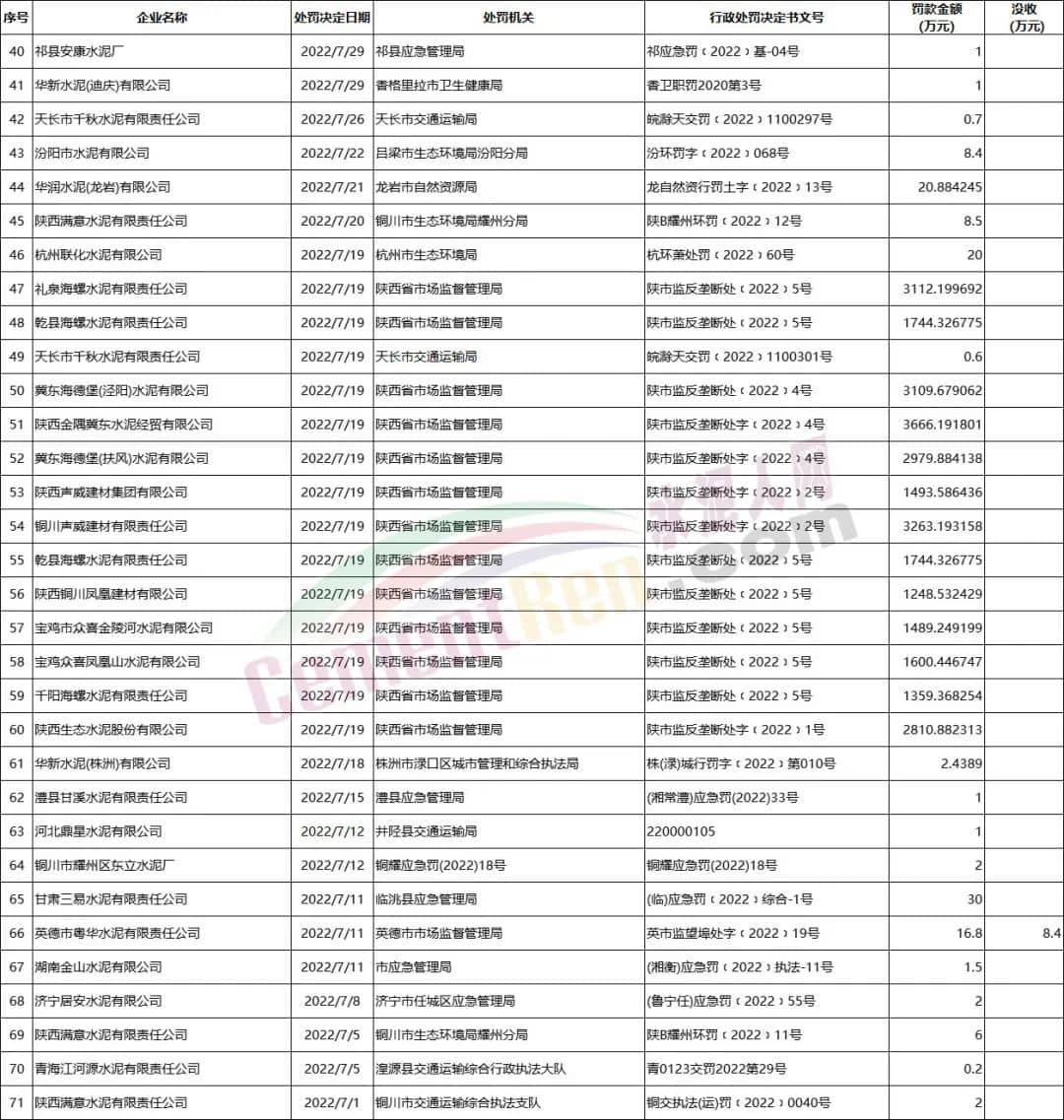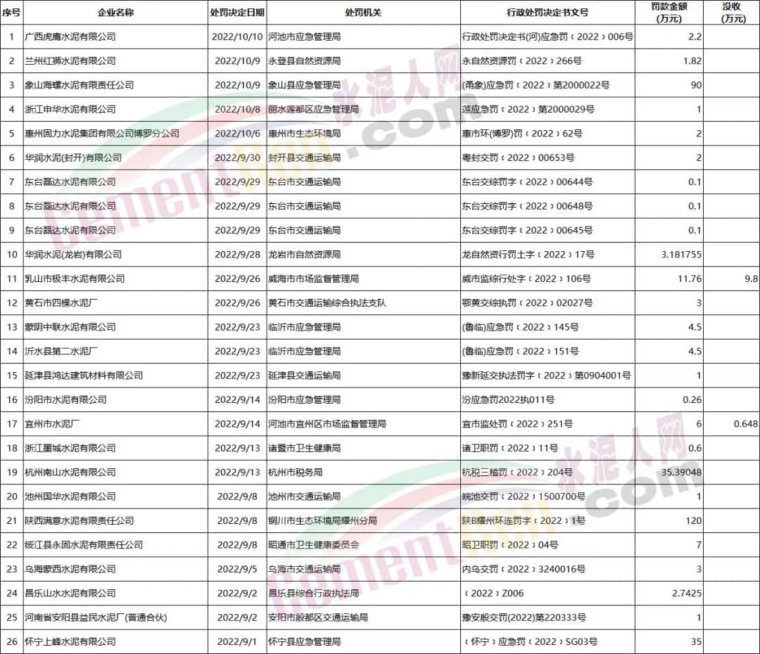 近两年,相关部门针对水泥行业提高了环保、安全、质量、技术等多方面要求,部分达不到要求的企业被通报处罚。仅2022年初至今包括海螺、华新、华润、金隅冀东在内的数百家水泥企业被处罚。其中,陕西13家水泥企业达成并实施垄断协议案被罚4.51亿元,达到了近年内市场监督管理部门的最高罚款金额。其中海螺水泥旗下的6家公司被罚1.06亿元;冀东水泥旗下3家公司被处以2018年度销售额3%的罚款,合计达9756万元。
