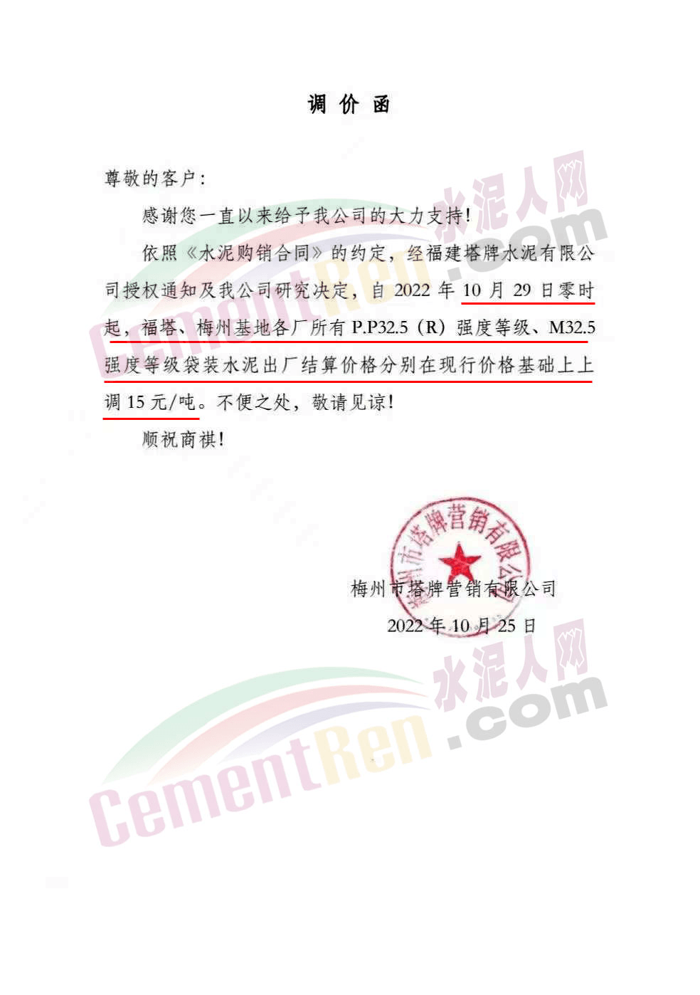 梅州市塔牌营销有限公司通知,10月29日零时起福塔、梅州基地各厂所有P.P32.5(R)强度等级、M32.5强度等级袋装水泥出厂结算价格分别在现行价格基础上上调15元/吨。