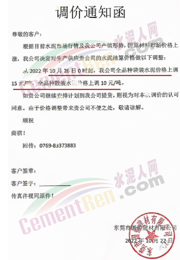 广东东莞市国钜建材有限公司通知26日0时起袋装水泥上调15元/吨,散装水泥上调10元/吨。