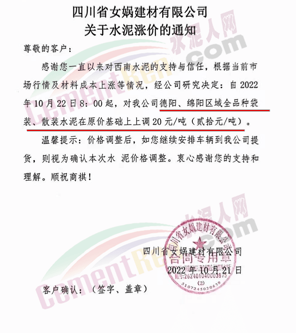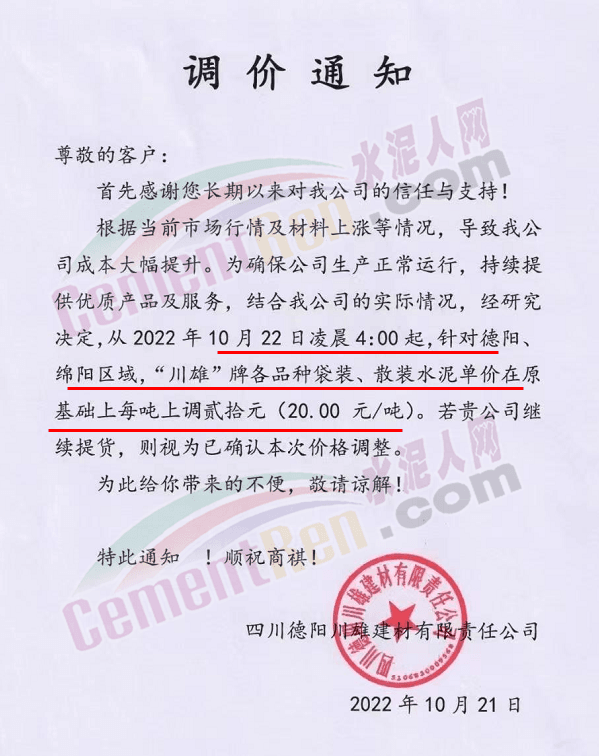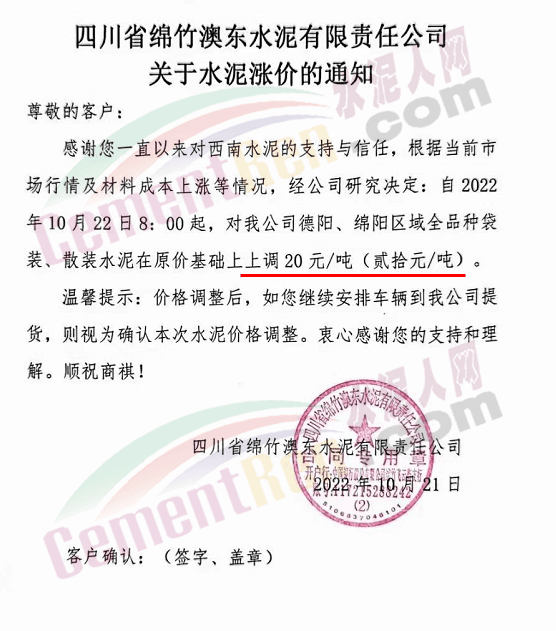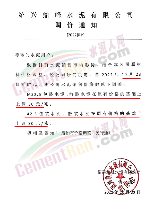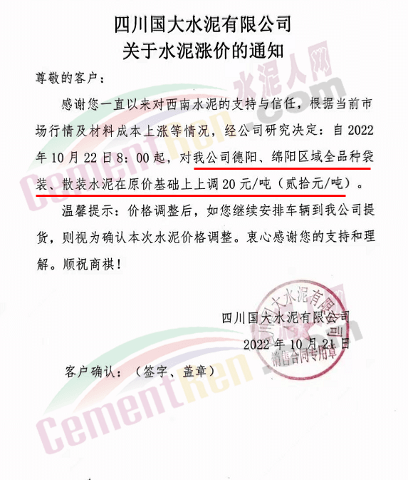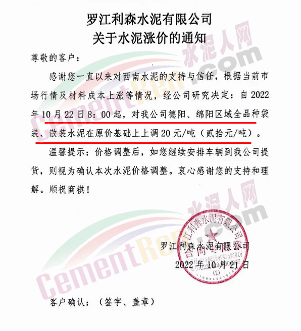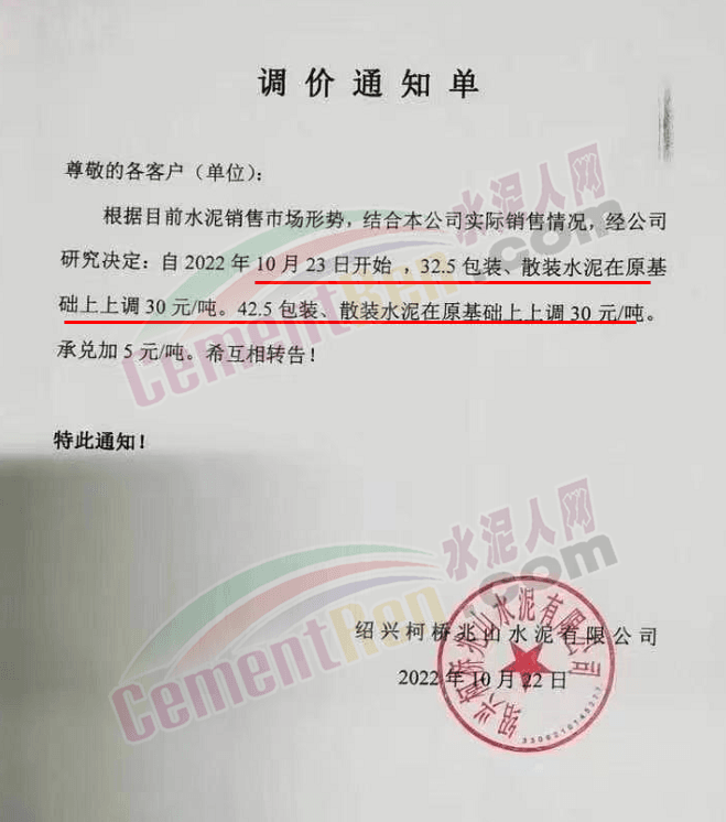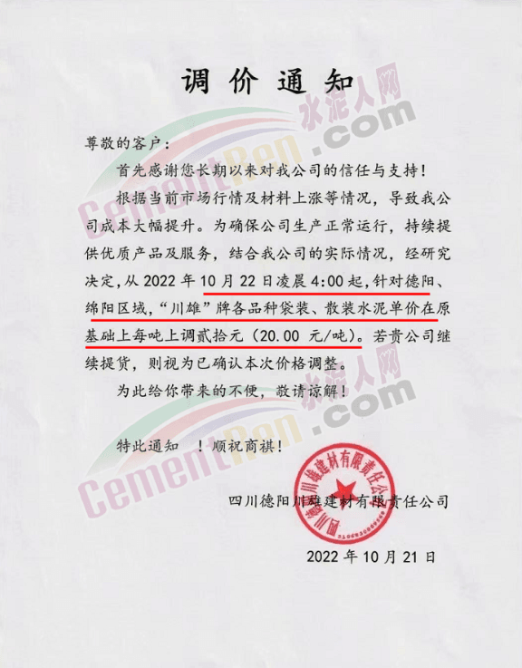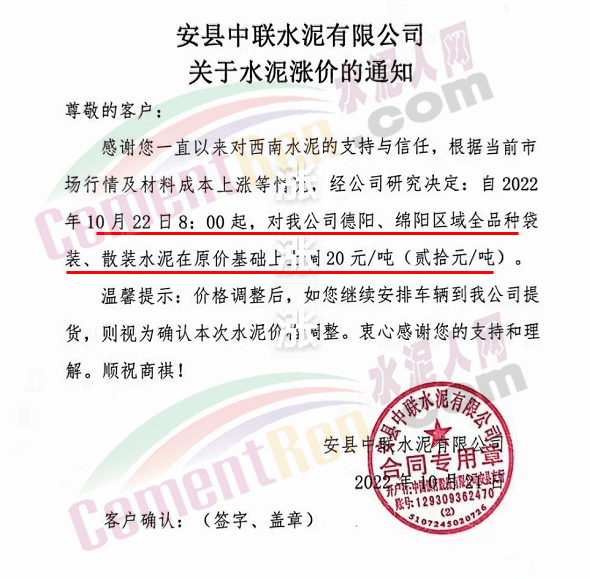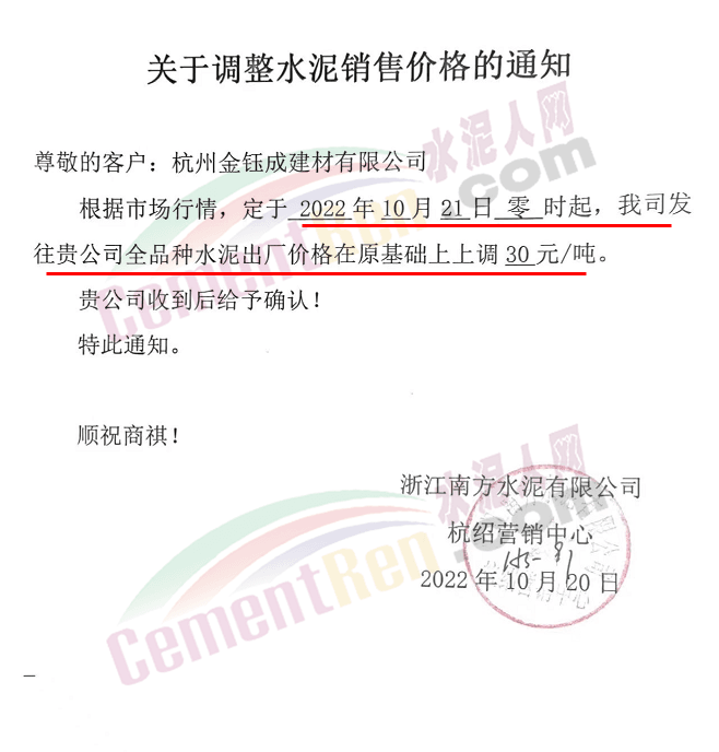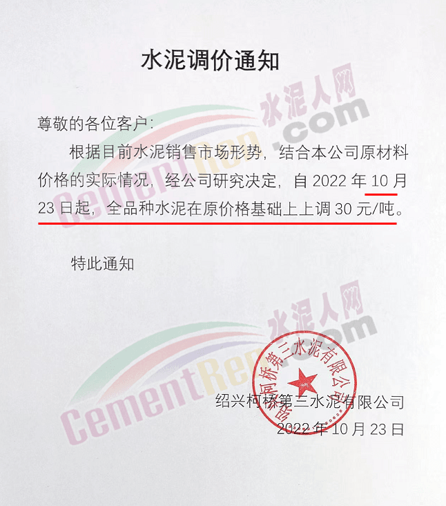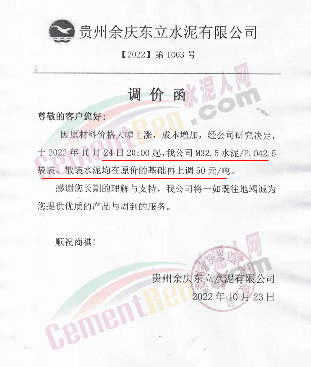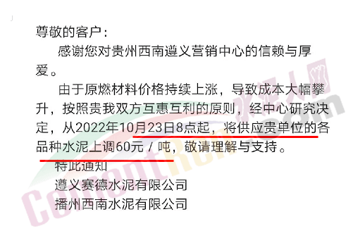 贵州西南遵义营销中心通知,10月23日起各品种水泥价格上调60元/吨.