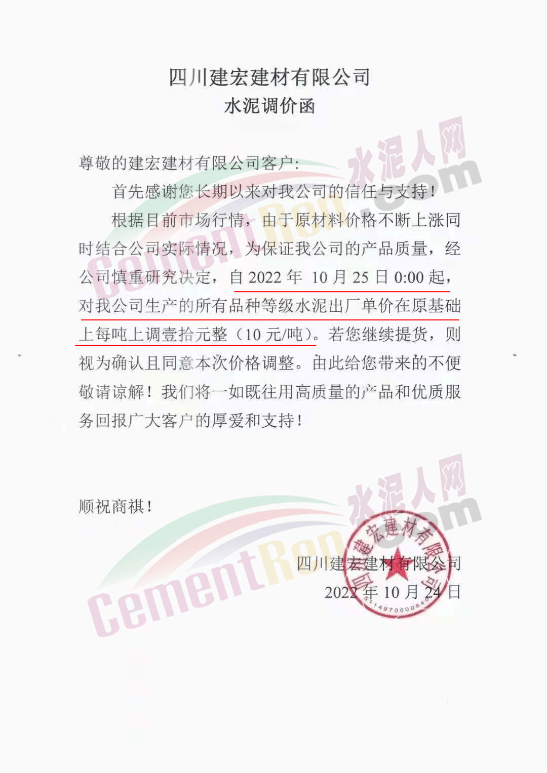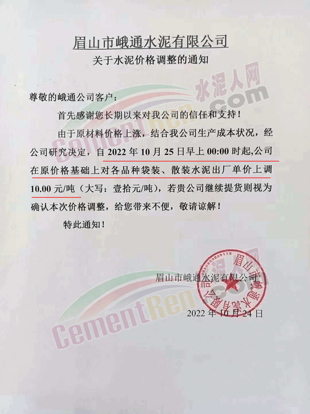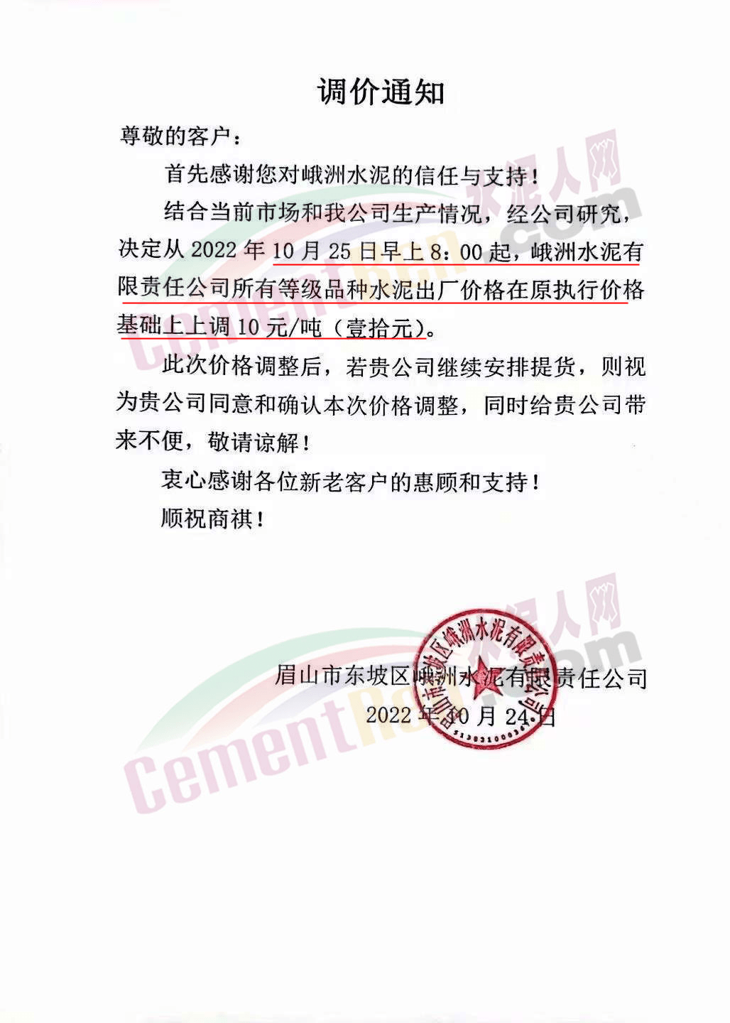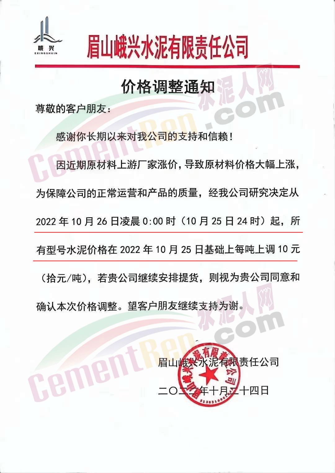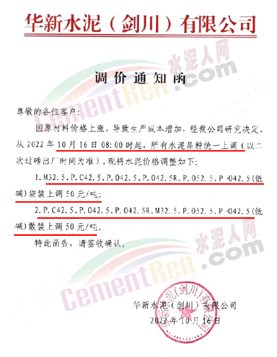 贵州西南遵义营销中心通知,10月23日起各品种水泥价格上调60元/吨.