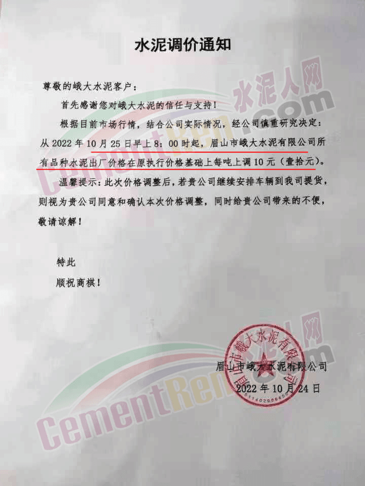 四川眉山多家水泥企业通知上调水泥价格10元/吨,经销商表示,这是“温柔一刀”。