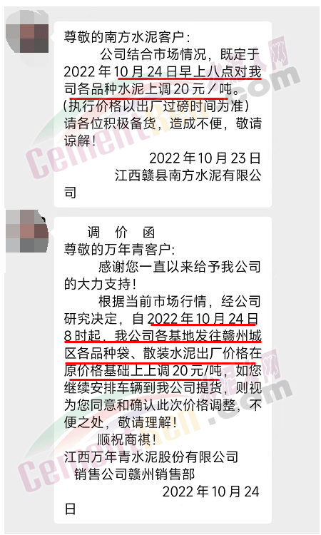 江西赣州区域主要品牌企业万年青水泥、南方水泥通知24日起上调20元/吨。