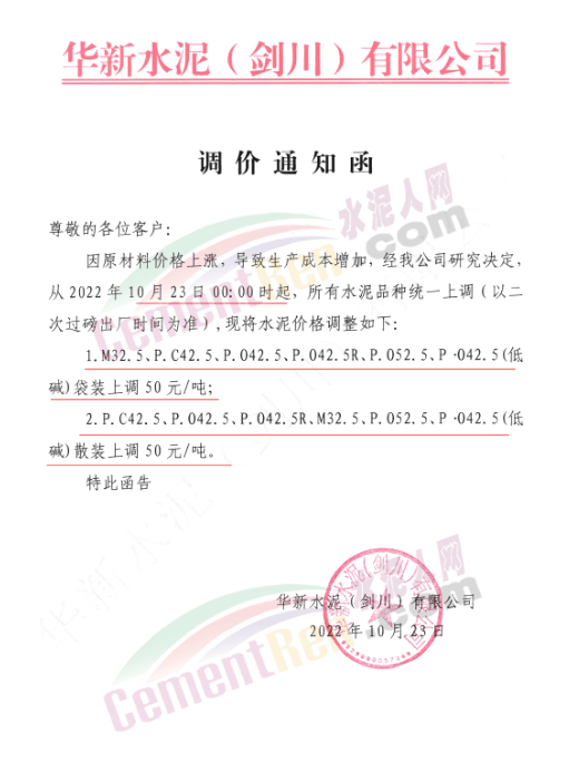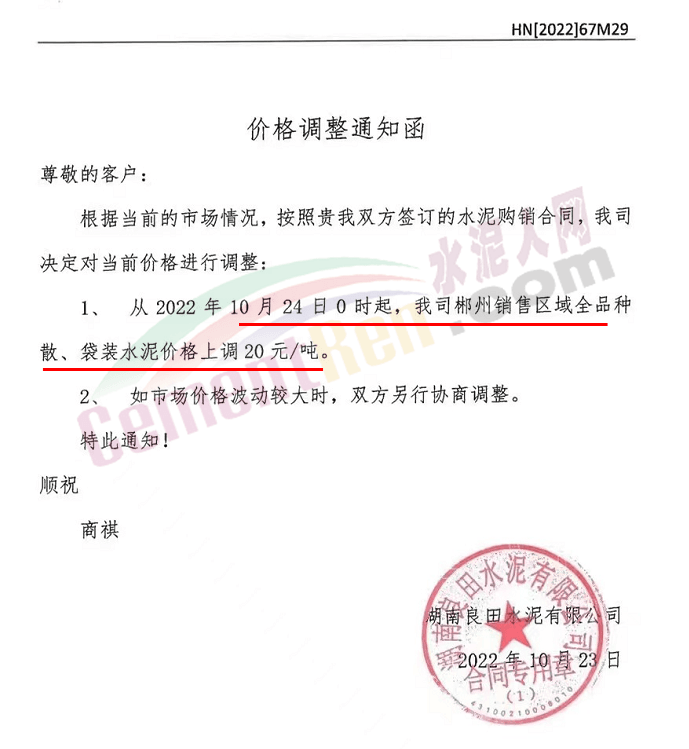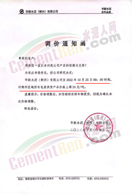 华新水泥(郴州)有限公司通知10月25日起对郴州区域所有包装供货价格上调20元/吨。