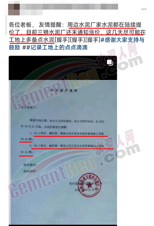 浙江杭州、绍兴区域水泥价格上调30元/吨,经销商提醒周边水泥厂家都在陆续提价,建议施工企业近几天尽可能在工地上多备点水泥。