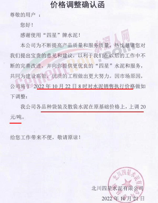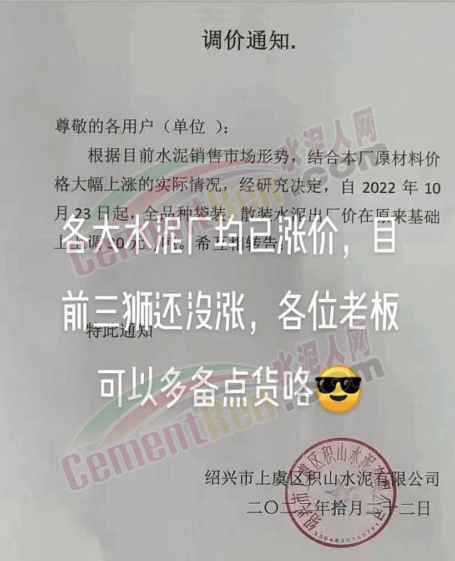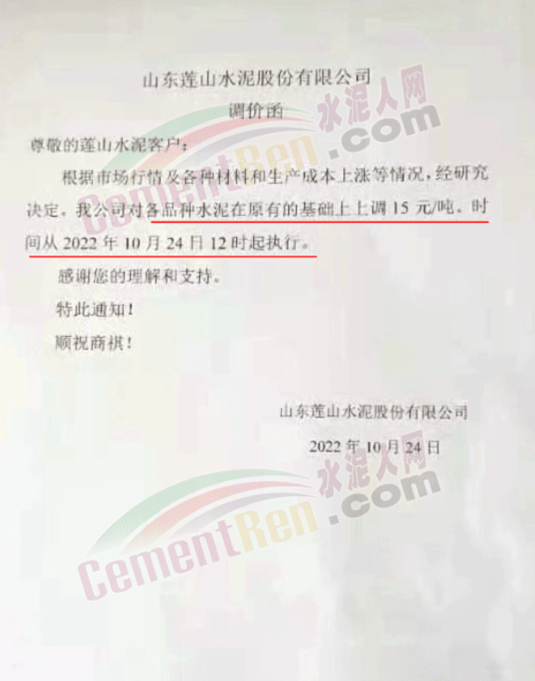山东莲山水泥股份有限公司通知,根据市场行情及各种材料和生产成本上涨等情况,经研究决定,从10月24日起对各品种水泥在原基础上上调15元/吨。