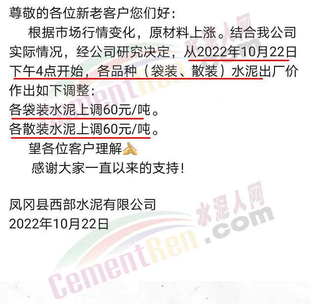 贵州省遵义市凤冈县西部水泥有限公司通知,22日起各标号水泥上调60元/吨。