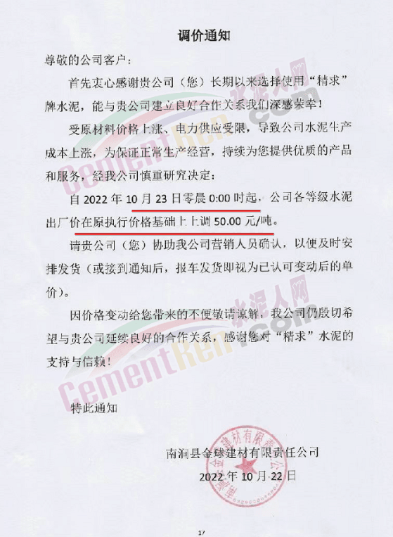 云南省大理白族自治州南涧县金球建材有限责任公司通知,受原材料价格上涨,电力供应受限,导致公司水泥生产成本上涨。自10月23日0时起上调50元/吨。