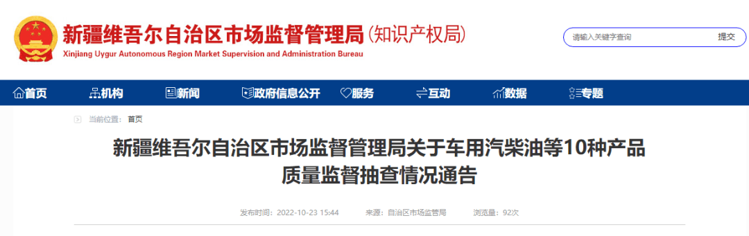 10月23日,新疆维吾尔自治区市场监督管理局发布关于车用汽柴油等产品质量监督抽查情况通告。