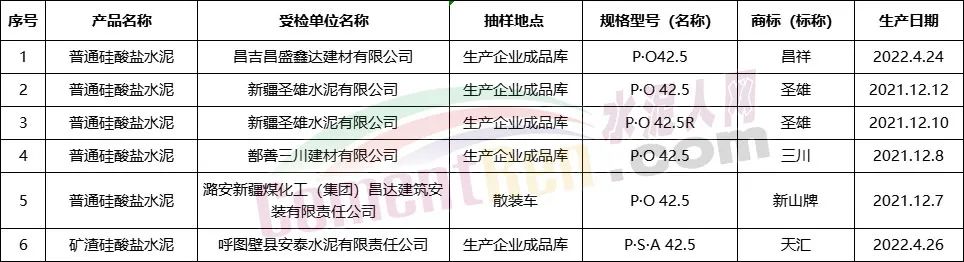 据通告,本次抽查的通用硅酸盐水泥产品,在生产领域抽查了74家企业的90批次产品,检出6批次产品不合格,不合格项目为氯离子。