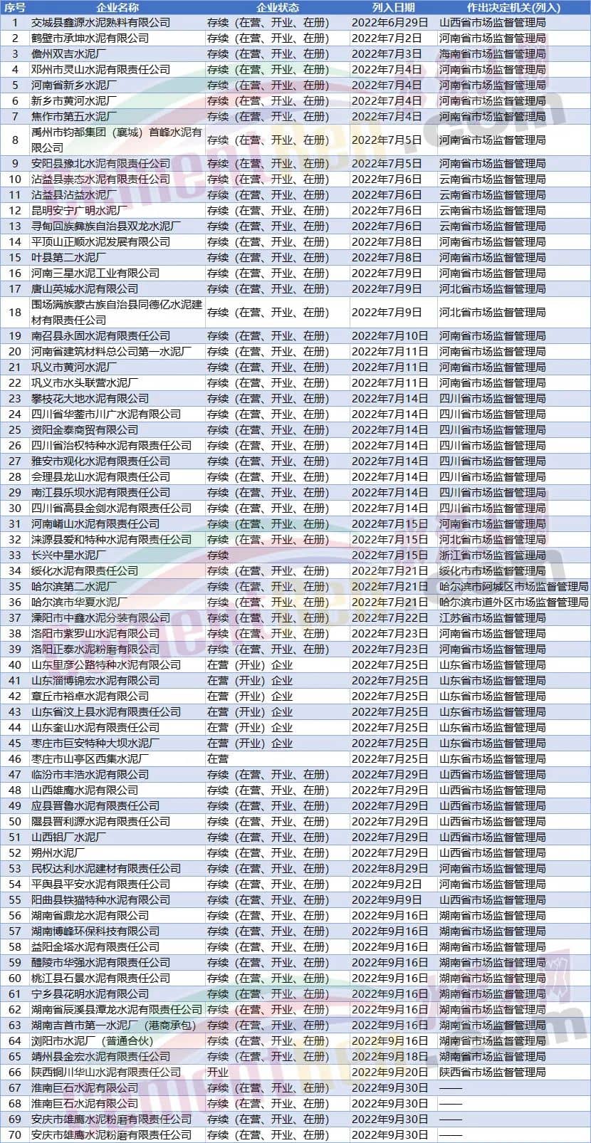 据水泥人网查询,近年来被列入严重违法失信的水泥企业并非只有这一家。仅2022年1月至今就有70家水泥企业被列严重违法失信企业名单。