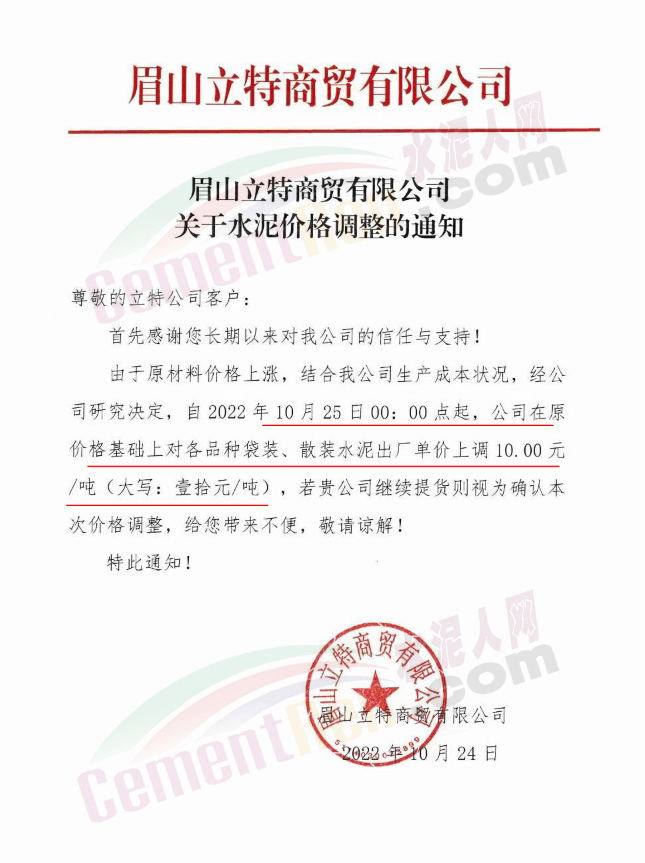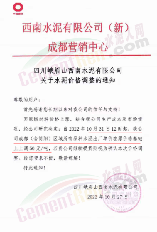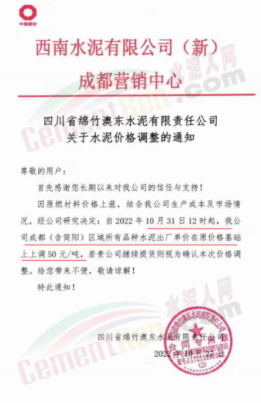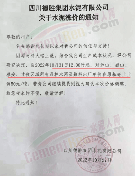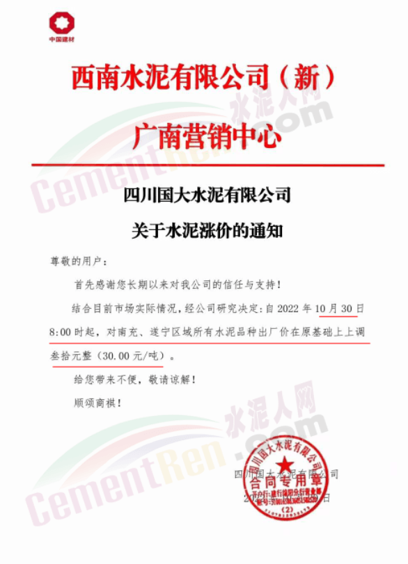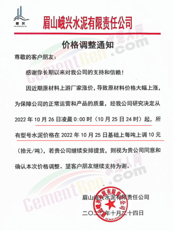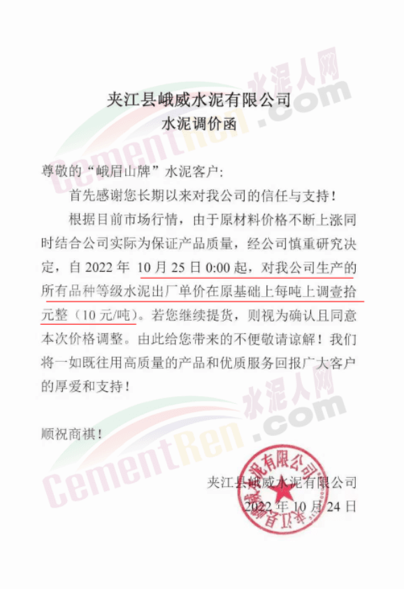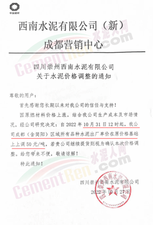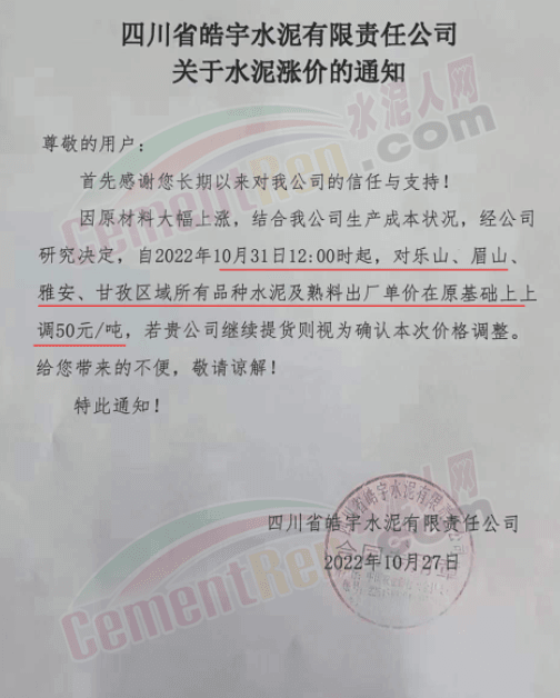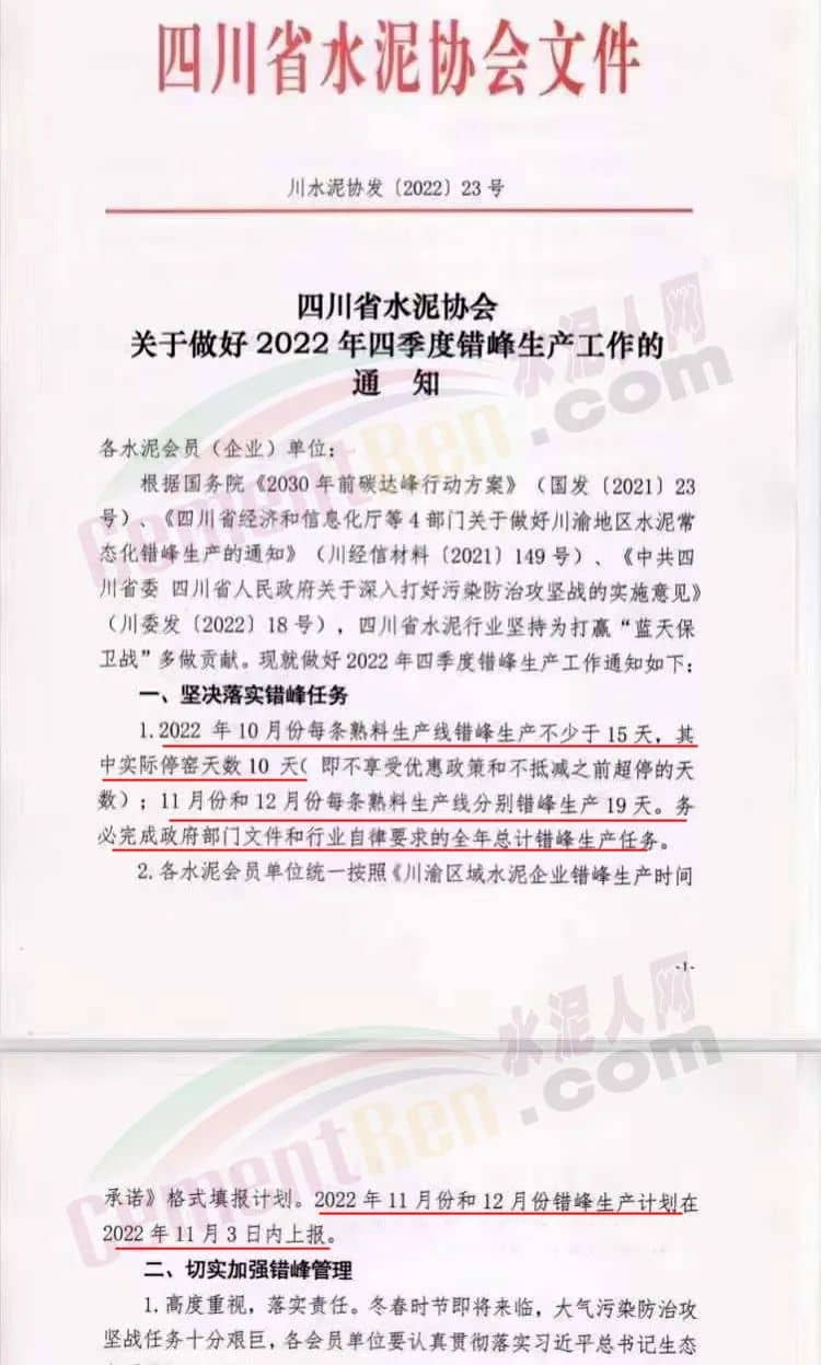 日前,四川省水泥协会发布《关于做好2022年四季度错峰生产工作的通知》提到10月份每条熟料生产线错峰生产不少于15天,其中实际停窑天数10天。(即不享受优惠政策和不抵减之前超停的天数);11月份和12月份每条熟料生产线分别错峰生产19天。务必完成政府部门文件和行业自律要求的全年总计错峰生产任务。 据了解,本轮调价是从10月30日起,包括粉磨站在内的多家水泥企业通知上调水泥价格50元/吨,熟料价格同步上调30元/吨。 据了解,早在10月25日,包括粉磨站在内的多家水泥企业曾经通知上调水泥价格10元/吨。