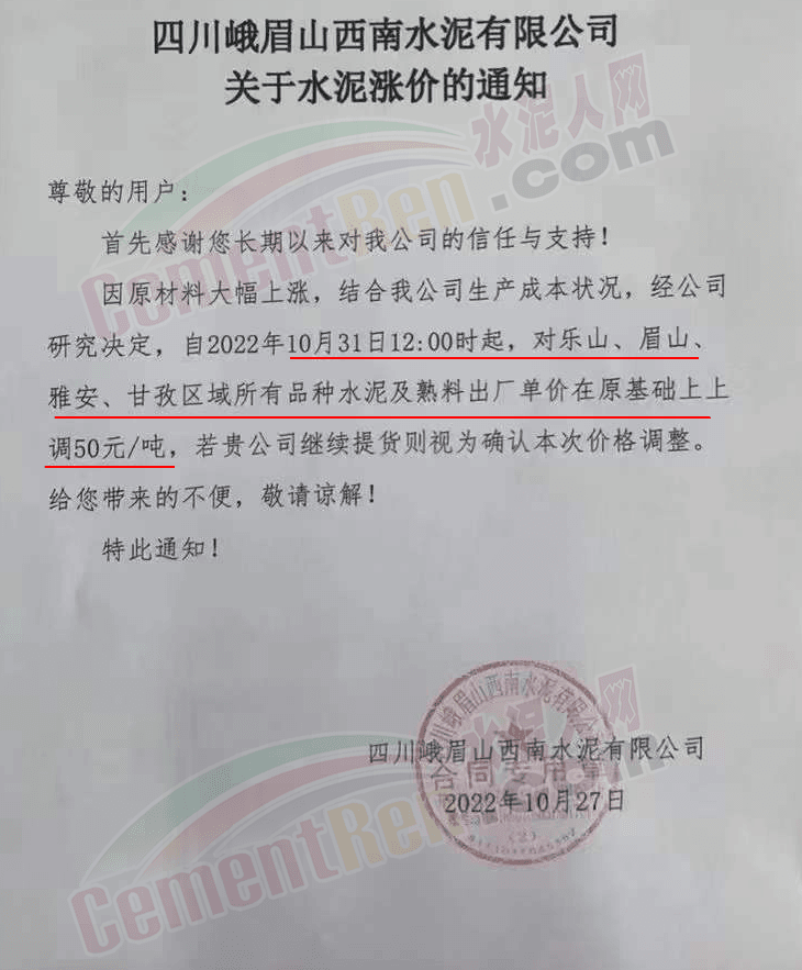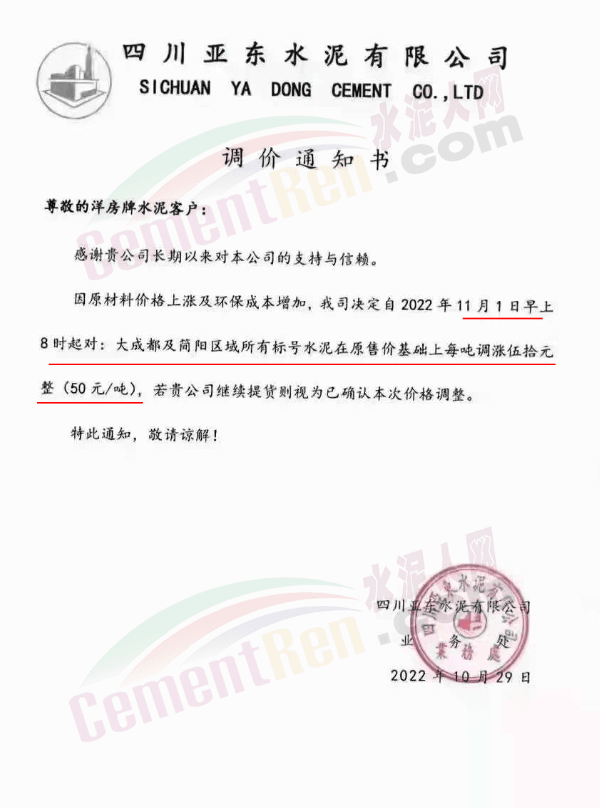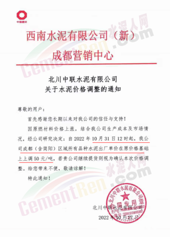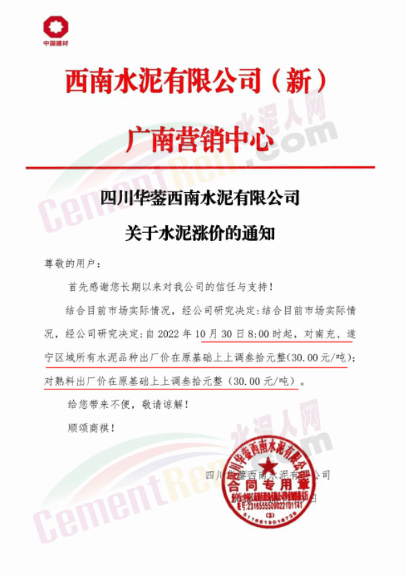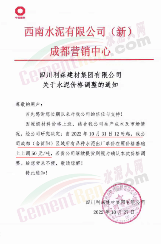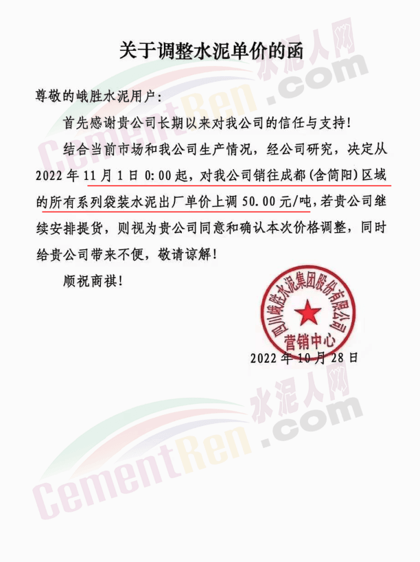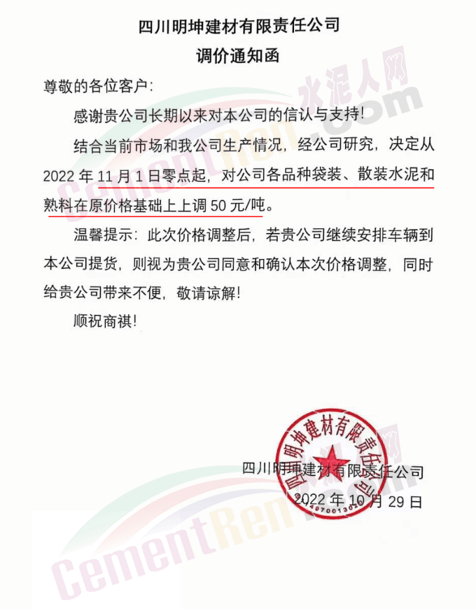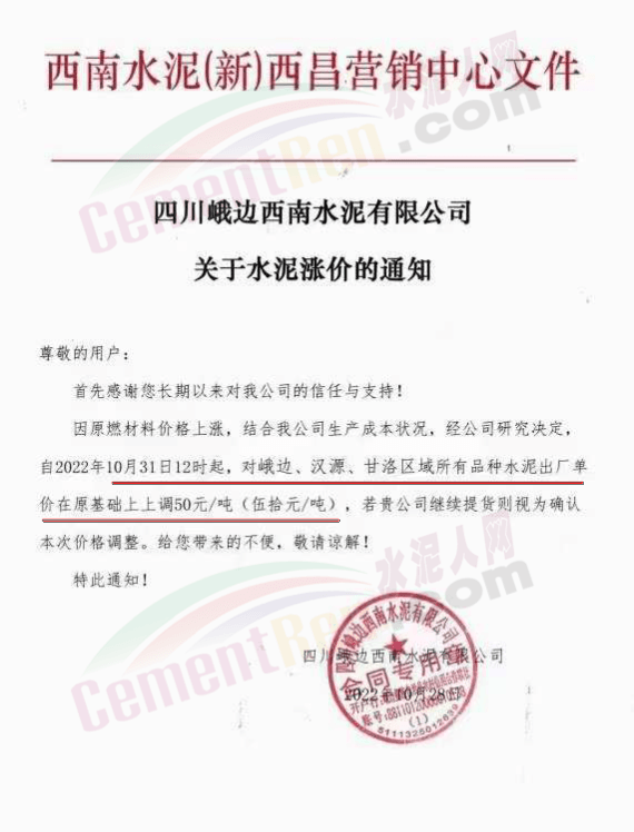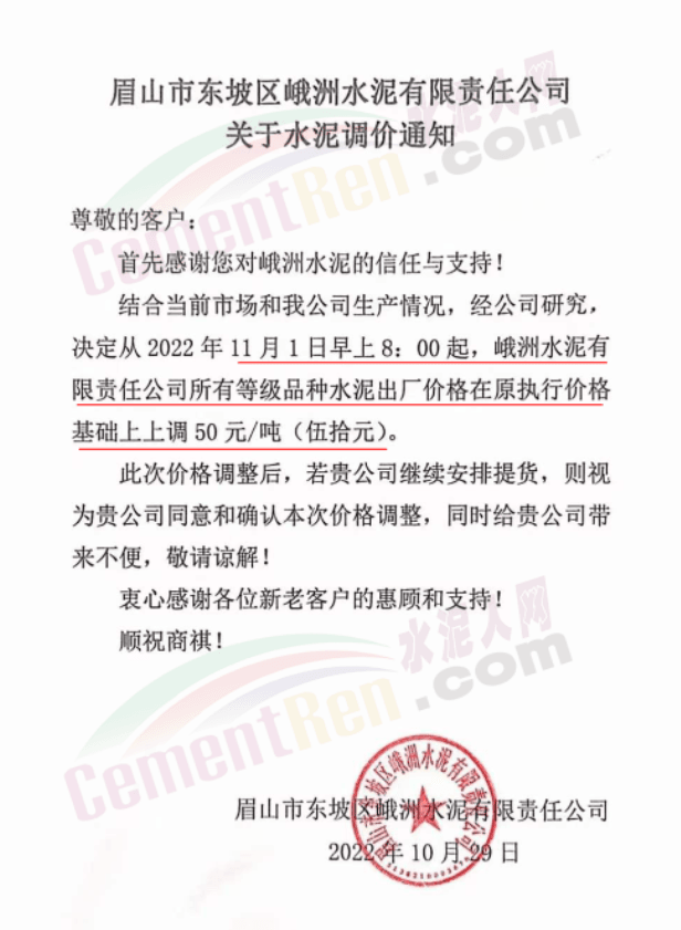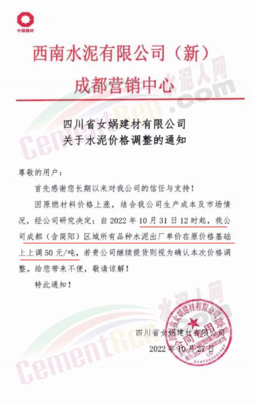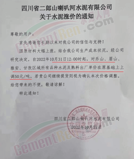日前,四川省水泥协会发布《关于做好2022年四季度错峰生产工作的通知》提到10月份每条熟料生产线错峰生产不少于15天,其中实际停窑天数10天。(即不享受优惠政策和不抵减之前超停的天数);11月份和12月份每条熟料生产线分别错峰生产19天。务必完成政府部门文件和行业自律要求的全年总计错峰生产任务。 据了解,本轮调价是从10月30日起,包括粉磨站在内的多家水泥企业通知上调水泥价格50元/吨,熟料价格同步上调30元/吨。 据了解,早在10月25日,包括粉磨站在内的多家水泥企业曾经通知上调水泥价格10元/吨。