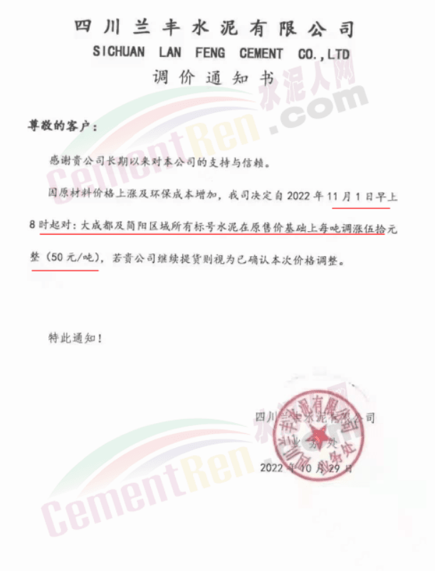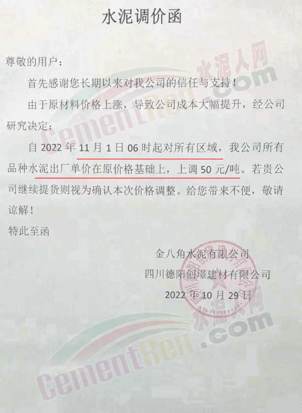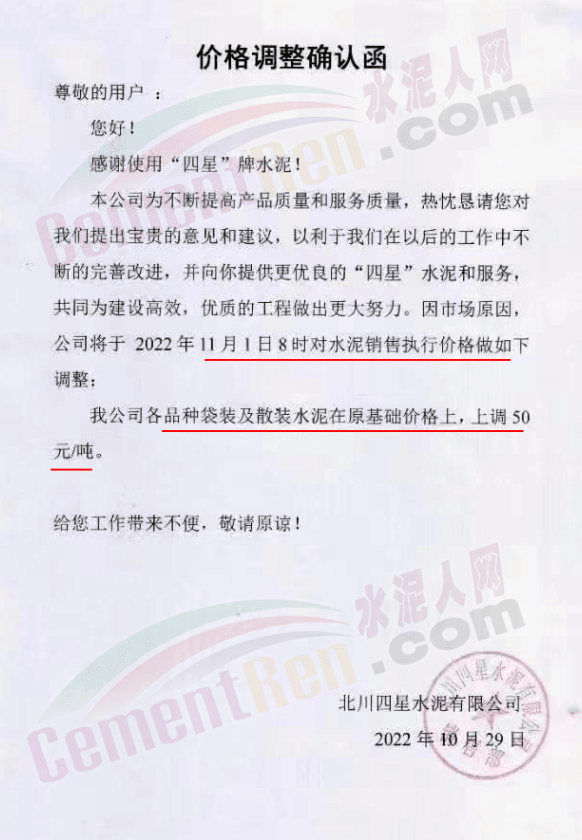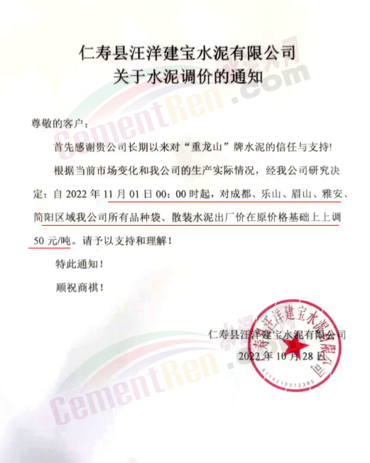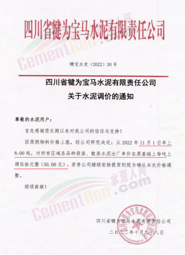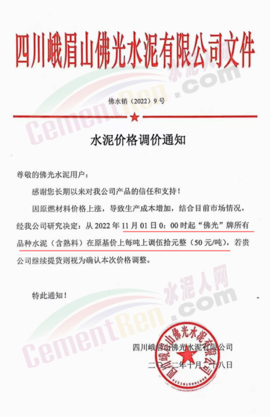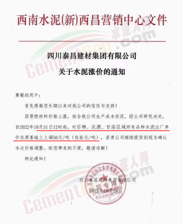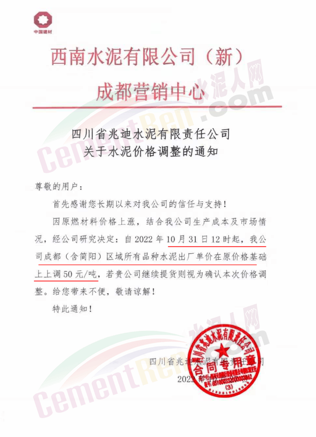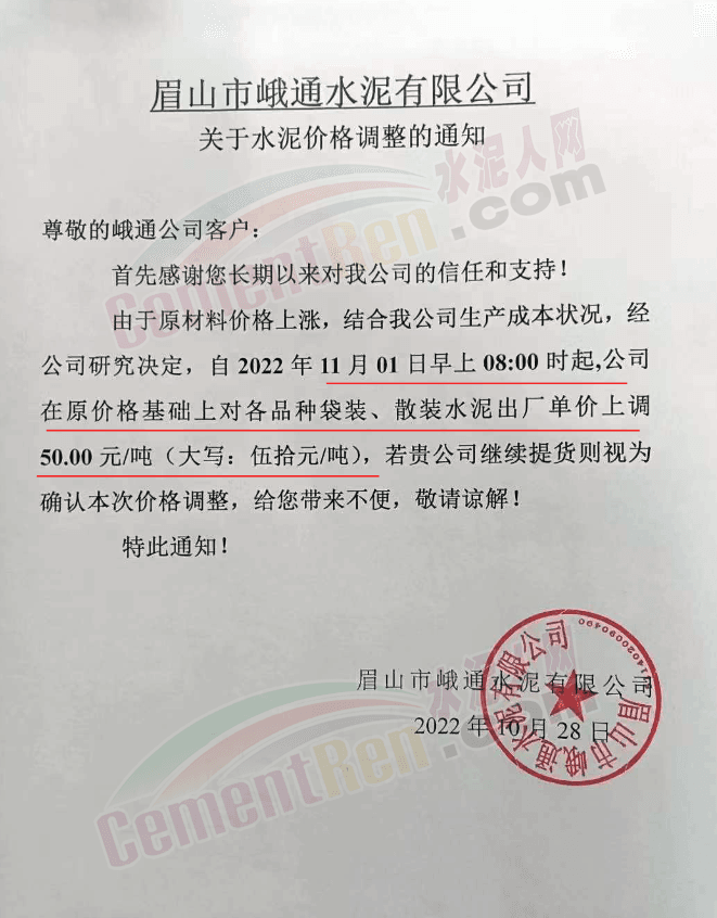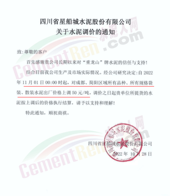 日前,四川省水泥协会发布《关于做好2022年四季度错峰生产工作的通知》提到10月份每条熟料生产线错峰生产不少于15天,其中实际停窑天数10天。(即不享受优惠政策和不抵减之前超停的天数);11月份和12月份每条熟料生产线分别错峰生产19天。务必完成政府部门文件和行业自律要求的全年总计错峰生产任务。 据了解,本轮调价是从10月30日起,包括粉磨站在内的多家水泥企业通知上调水泥价格50元/吨,熟料价格同步上调30元/吨。 据了解,早在10月25日,包括粉磨站在内的多家水泥企业曾经通知上调水泥价格10元/吨。