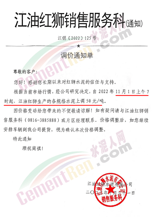 江油红狮水泥、江油拉豪双马水泥、四川绵竹进鑫化建有限责任公司通知,自11月1日上午上调水泥价格50元/吨。